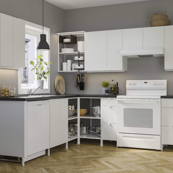 A kitchenette that can also serve as a freestanding hutch, bringing a warm and traditional look to your dining space. Open shelves for things you want to show and closed storage to hide the clutter.
